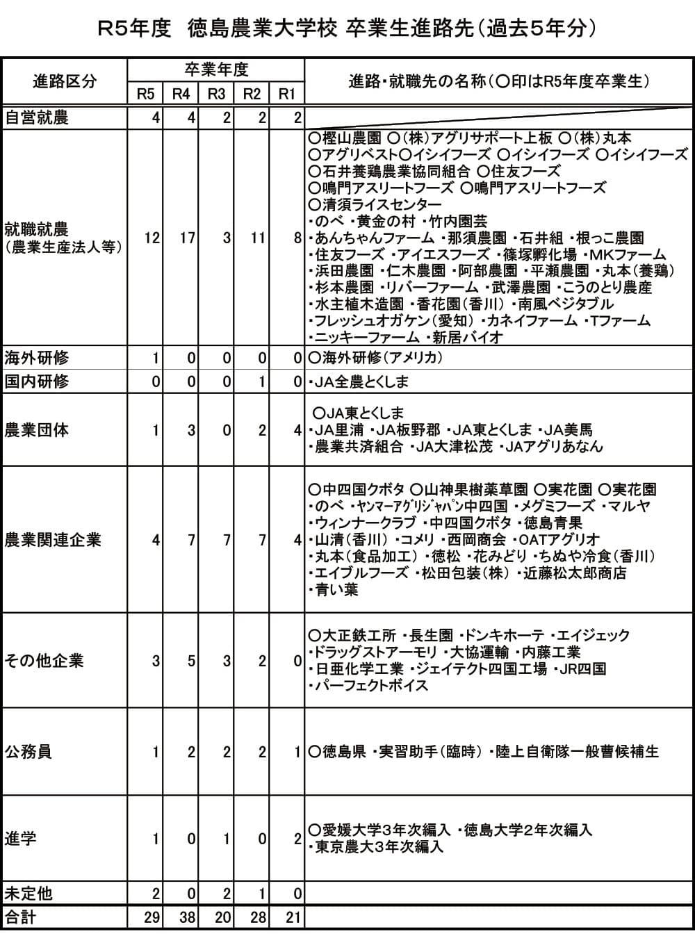 本校では、ハローワーク、人材育成会社、農業関連企業等と連携したキャリア教育に取り組んでいます。徳島新卒応援ハローワーク(徳島公共職業安定所)での研修、人材育成会社講師による「キャリア形成」の授業、また「農業青年の集い」や企業による校内での就職説明会の開催等、学生のキャリア発達を支援するための機会が多く設定されています。県下の農業法人を中心に、本校の卒業生が活躍している企業も多く、農大生は次代の農業・関連産業を担う即戦力となり得る人材として、さらに期待が高まっています。