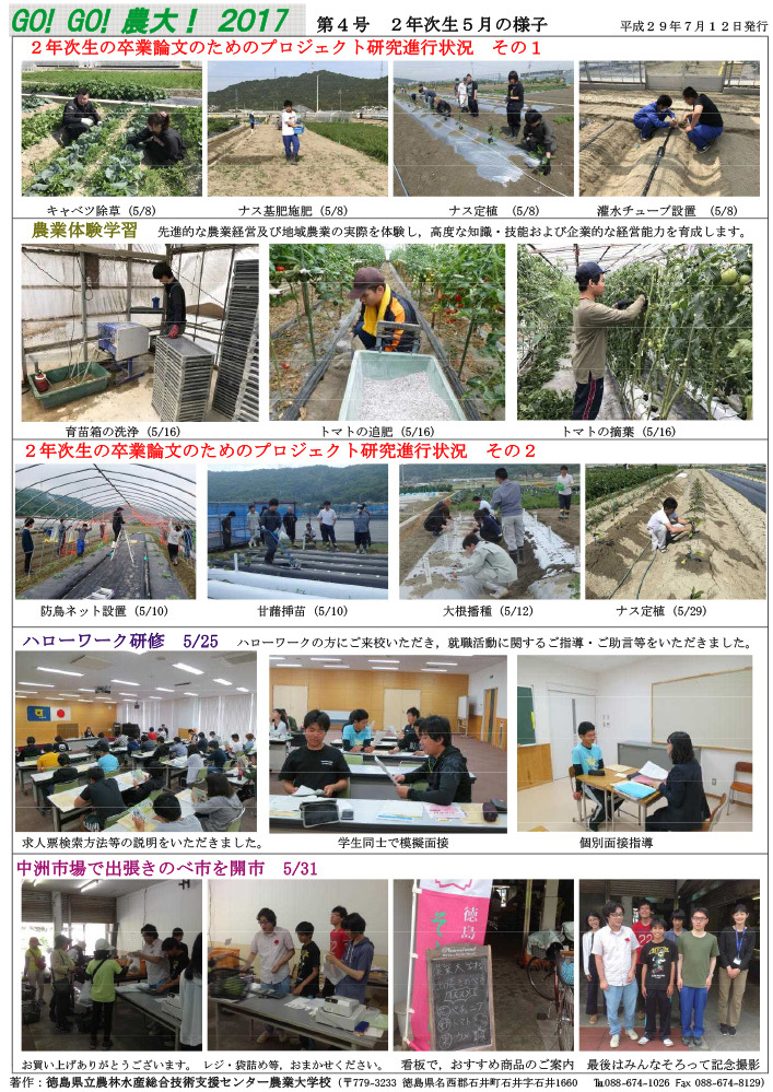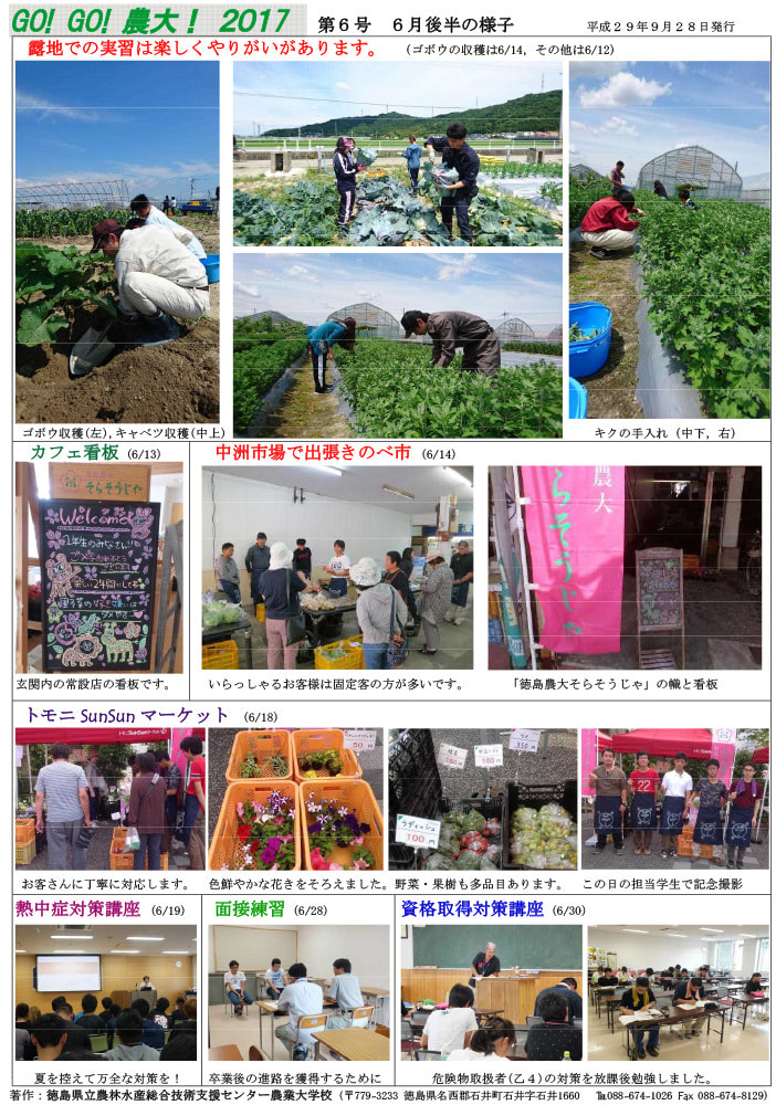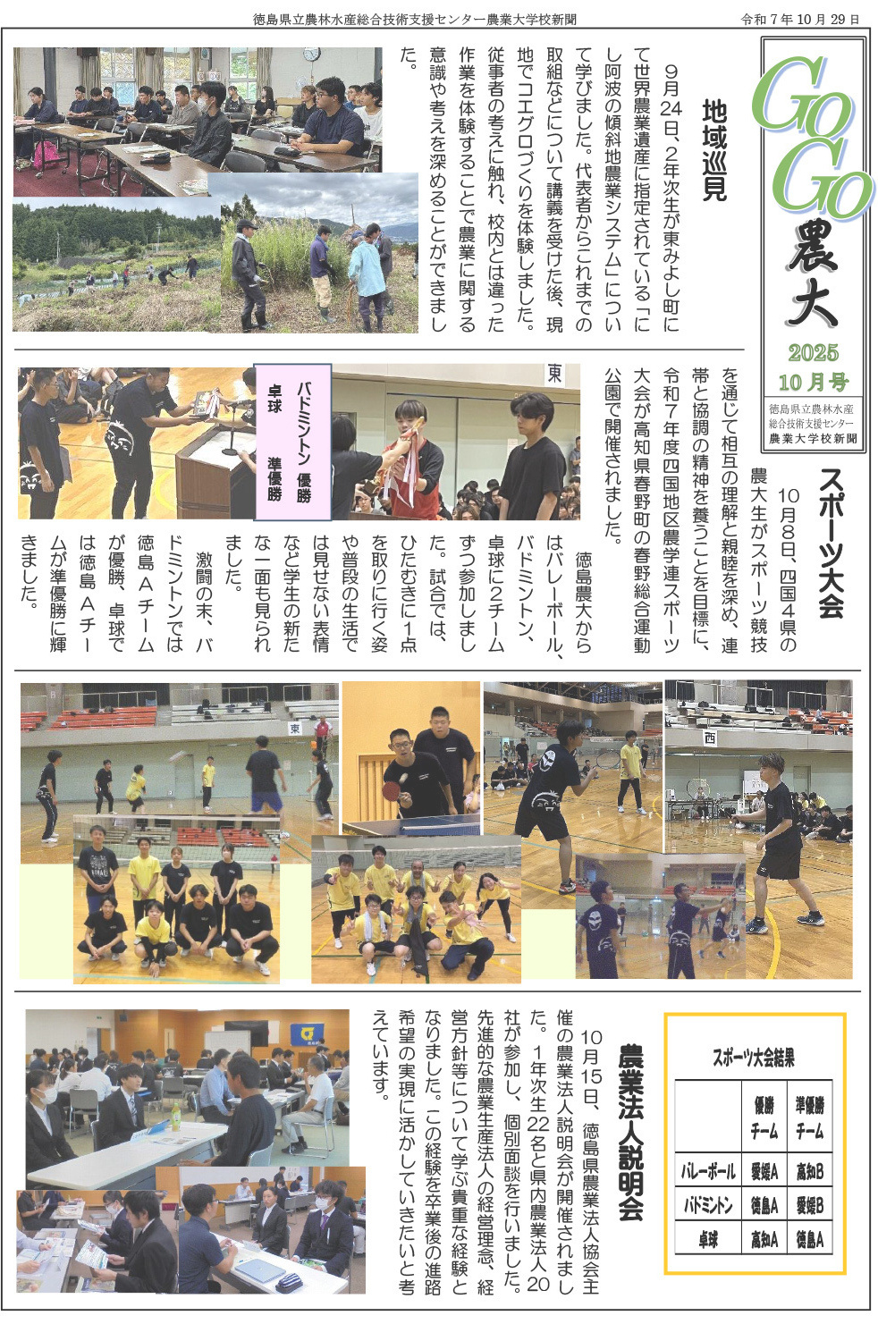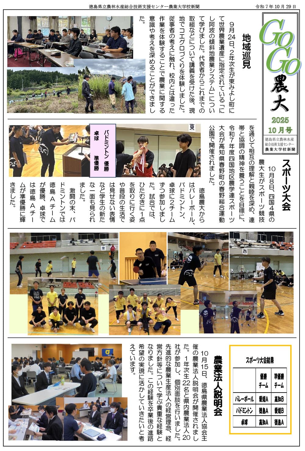 農業大学校の授業風景や作業の様子、イベントや自治会活動などを紹介する農大通信誌「GO!GO!農大!」をほぼ毎月発行しています。当コーナーでは、最新の「GO!GO!農大!」記事を掲載します。また、過去の記事についてもご覧いただけます。