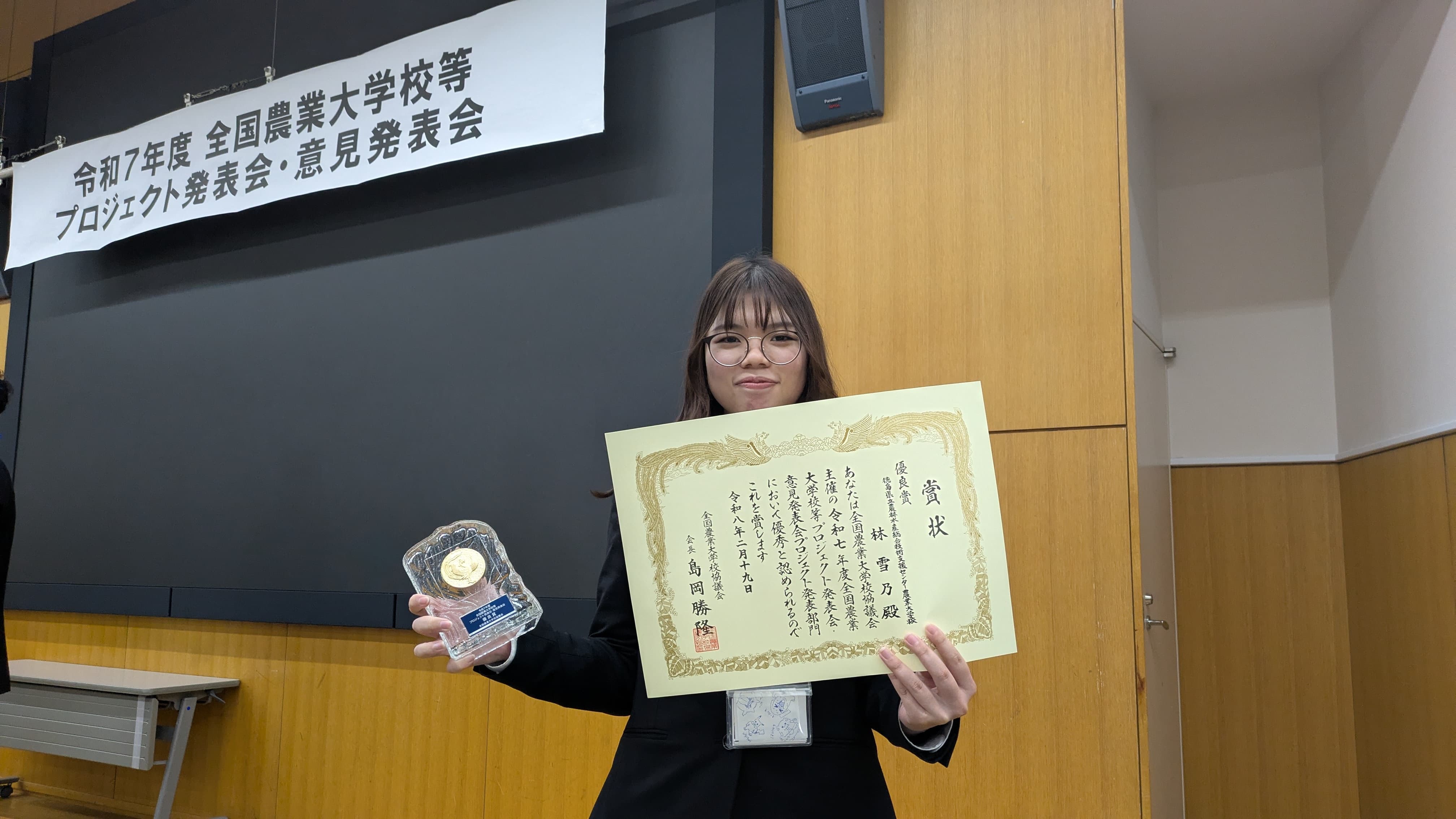 さらに林さんは、2月17日から19日に東京都で開催された「全国農業大学校等プロジェクト発表会」にブロック代表として出場。全国の舞台でも堂々とした発表を行い、「優良賞(全国農業大学校協議会会長賞)」に輝きました。