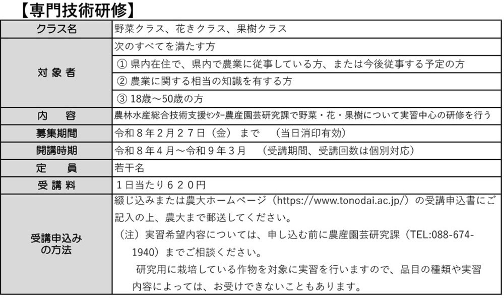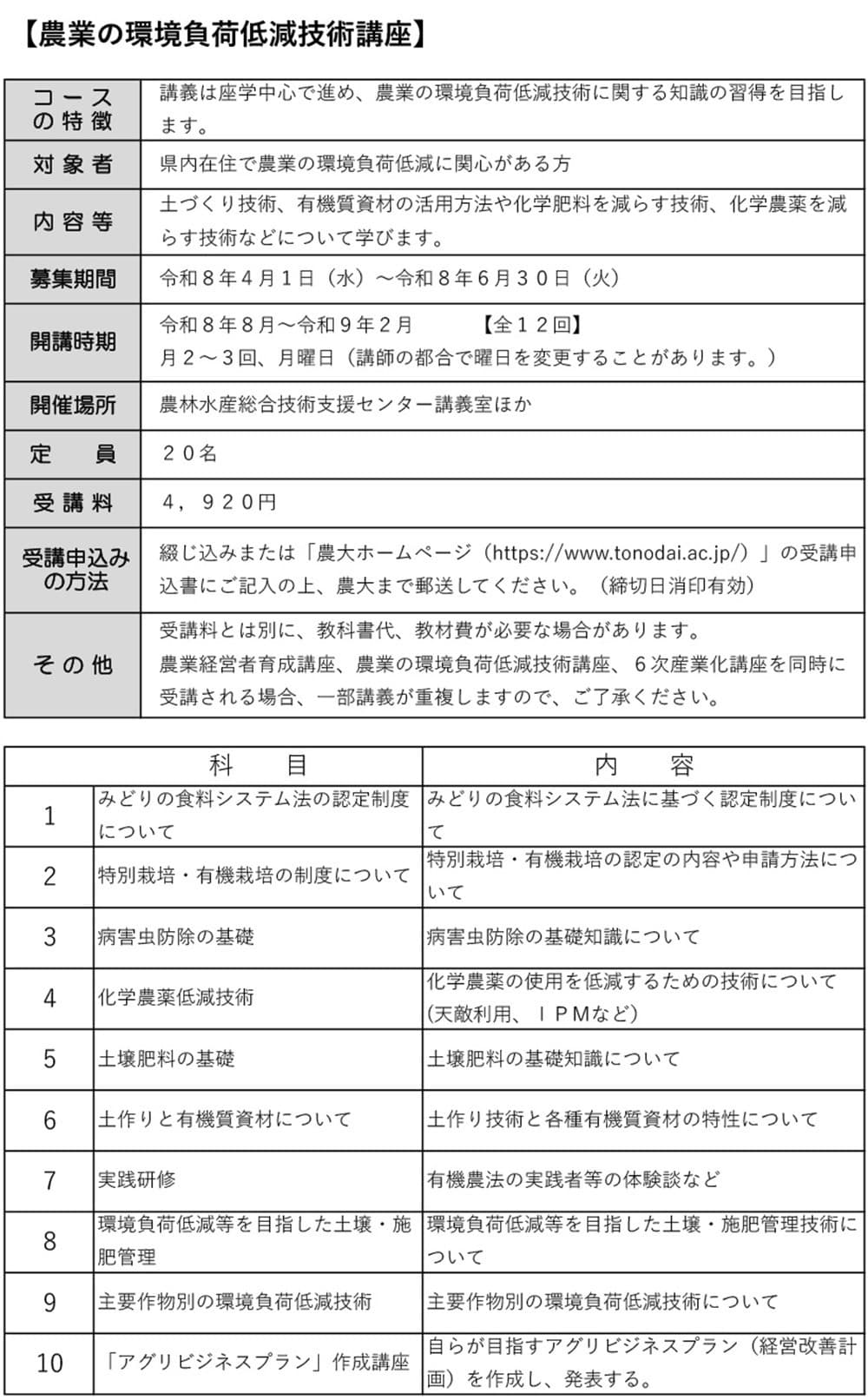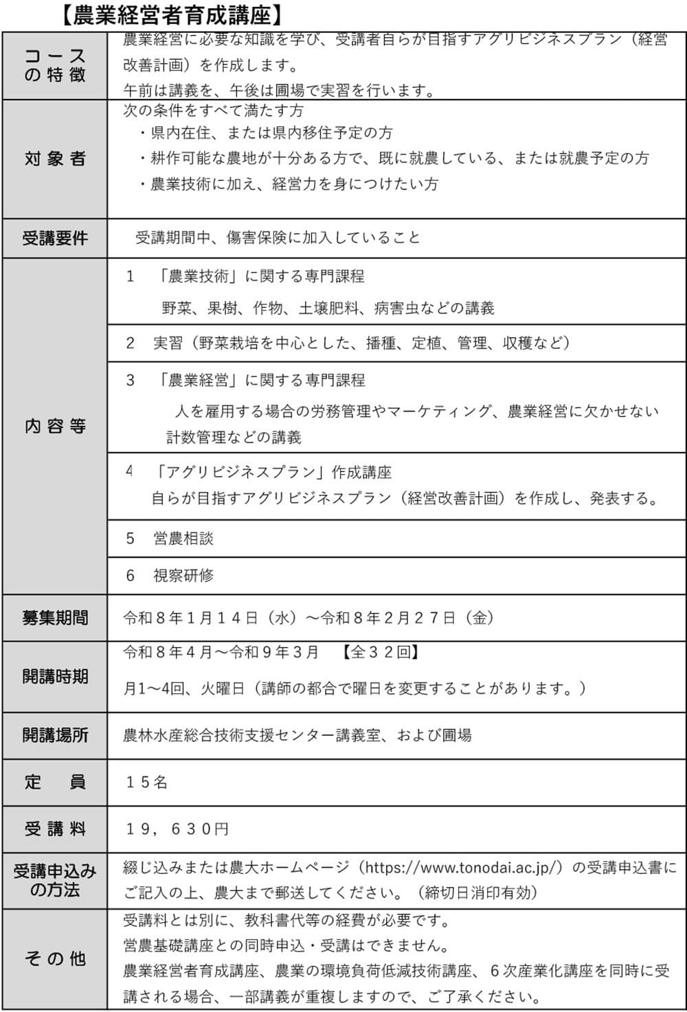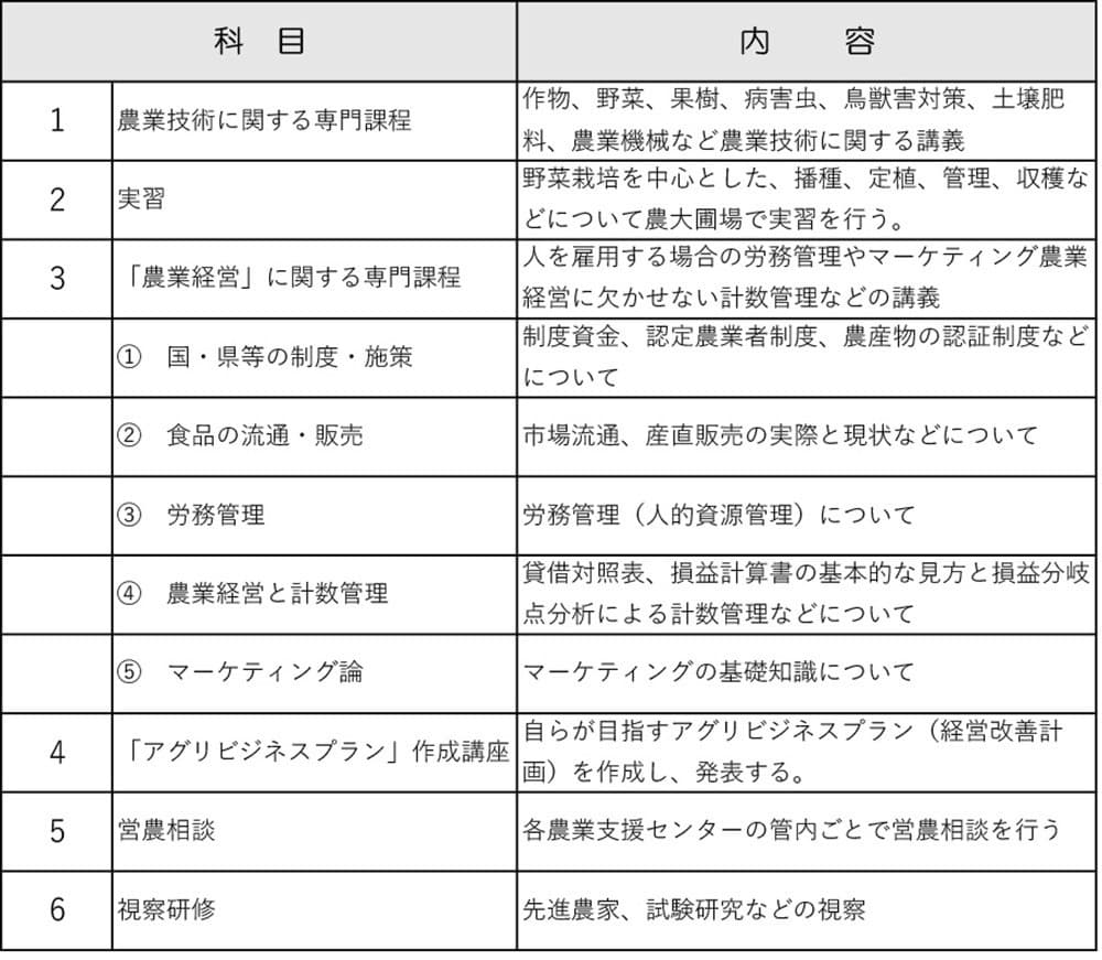 農業経営者育成講座/専門技術研修/農業の環境負荷低減技術講座/6次産業化講座/農業機械安全使用者養成講座