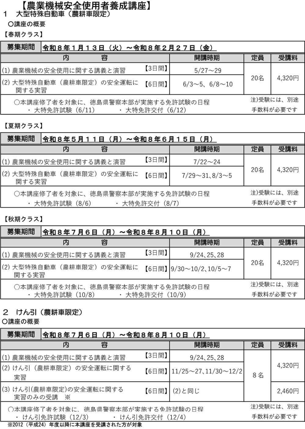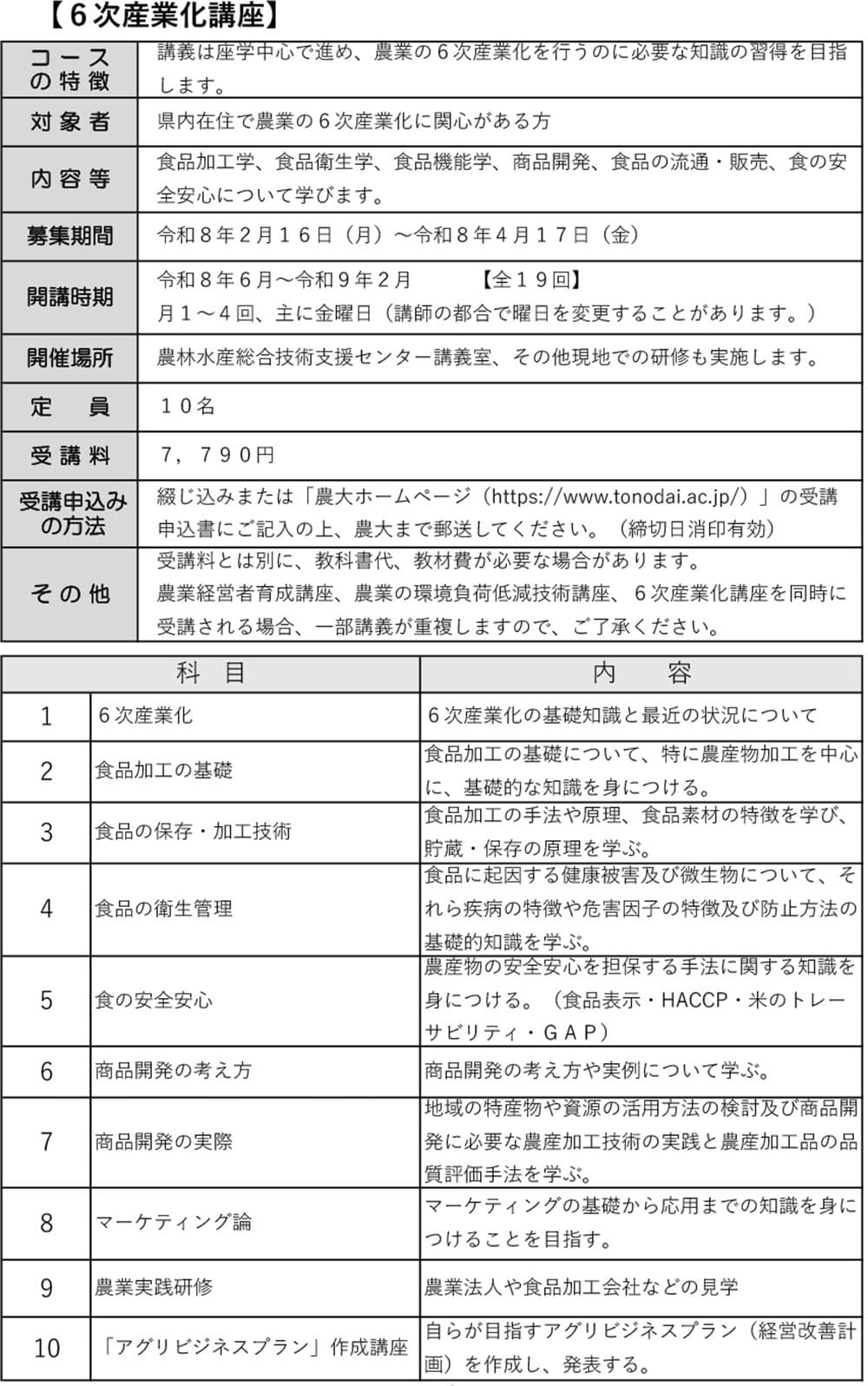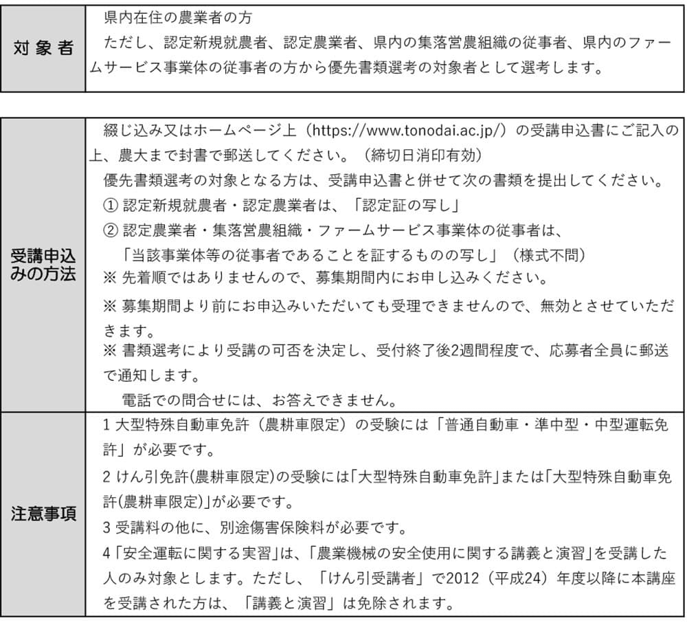農業経営者育成講座/専門技術研修/農業の環境負荷低減技術講座/6次産業化講座/農業機械安全使用者養成講座